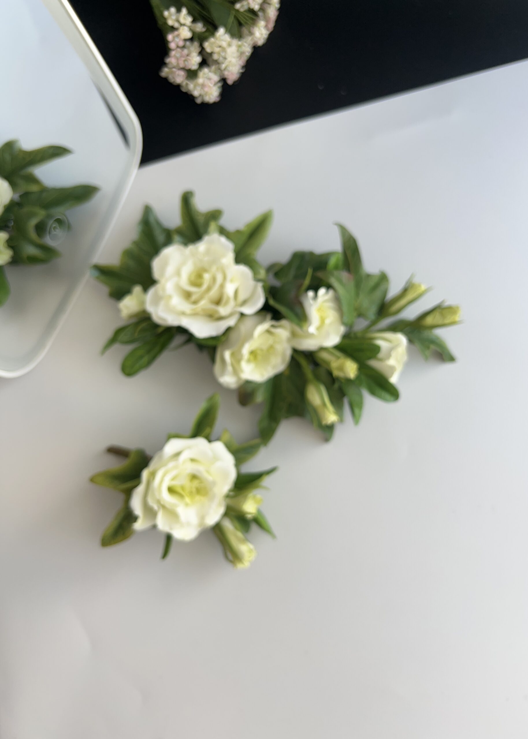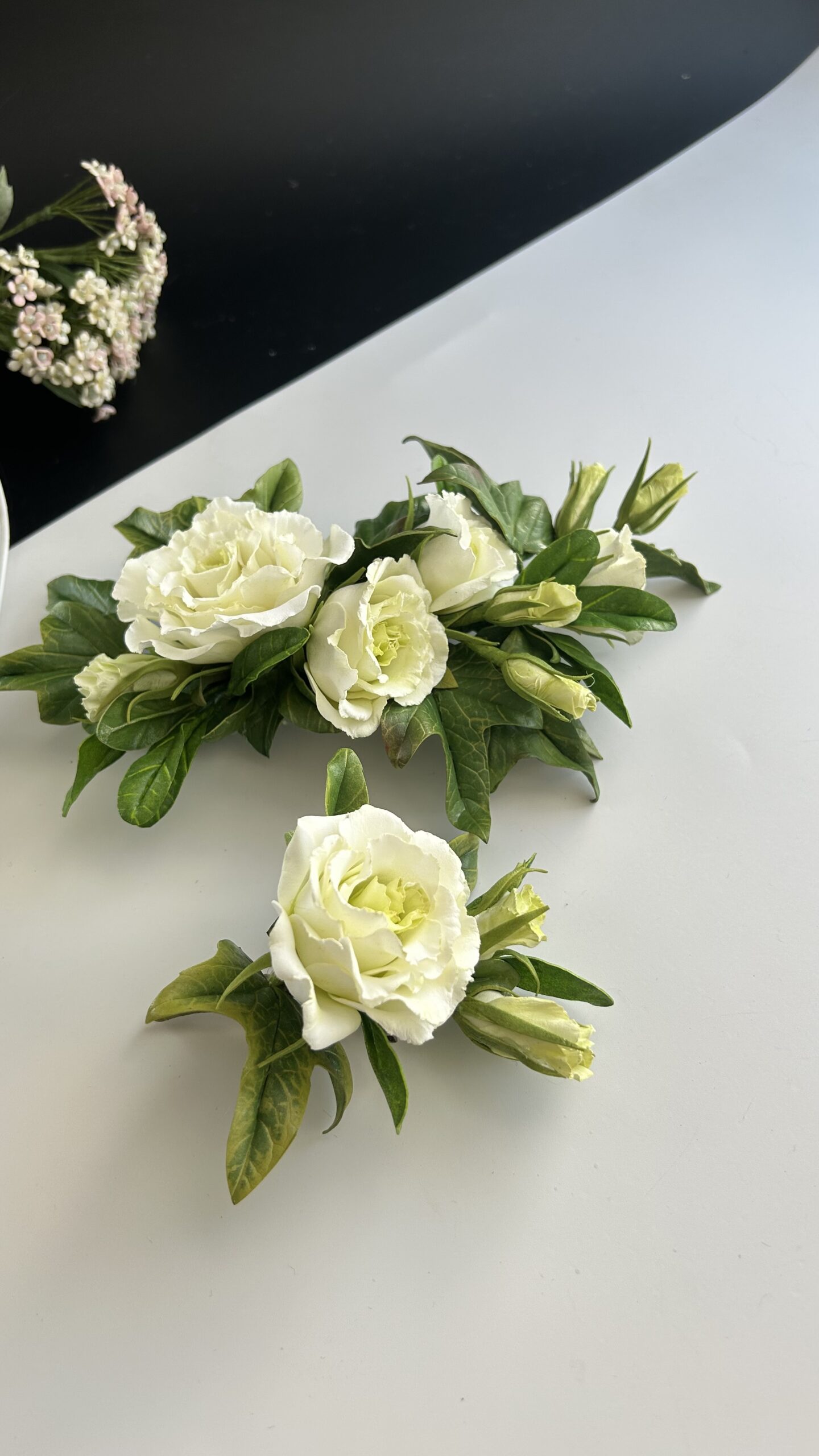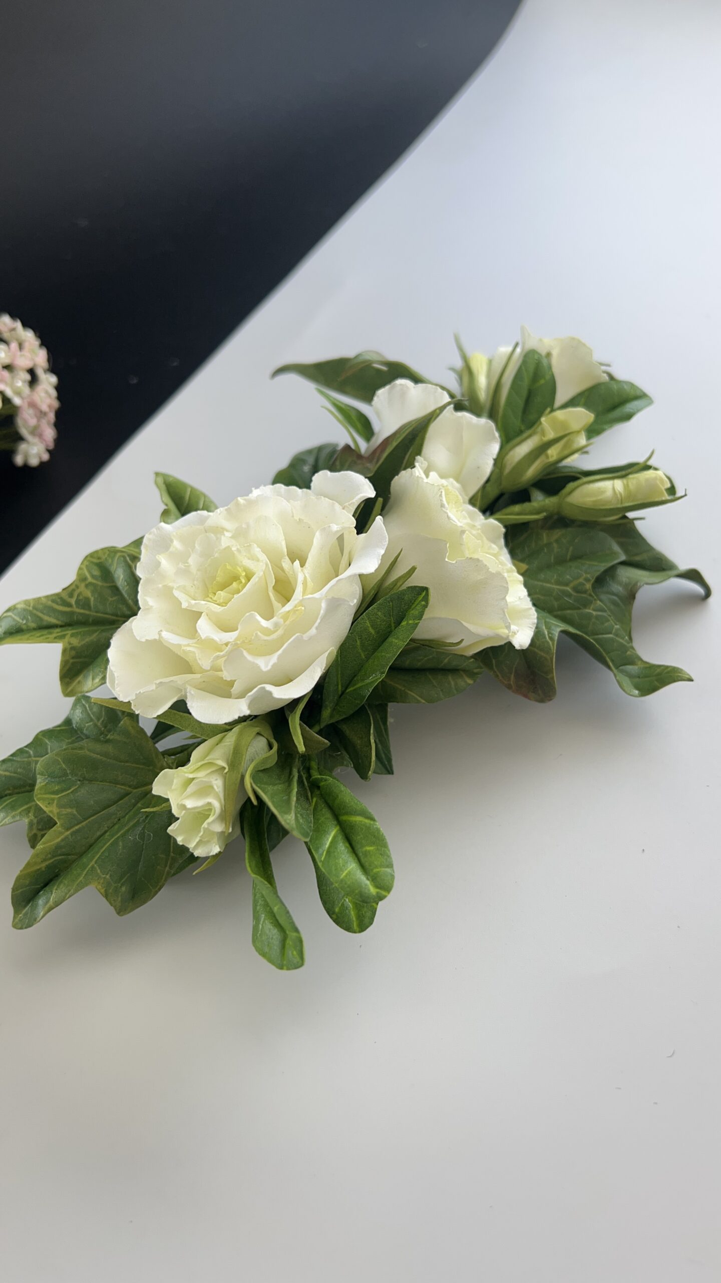 Нежные цветы эустомы в свадебных украшениях Заколка для волос.длина 21 см в длину. Основа металический зажим 7 см длина. Бутаньерка исполнена в стиле заколки. Цветы и листья на проволочной основе , что даёт возможность изменять их расположение. Ручная работа. С любовью к Вам Елена.